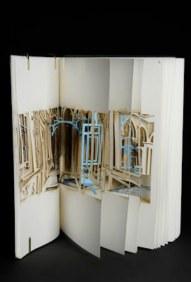 You pick up a book, and you open the covers... and a series of rooms begins to pass by, like the frames of a film or sequences in a flipbook, and it's all due to laser-cut gaps and remainders. How amazing to think that we could slice entire works of architecture into all the books around us, so that "reading" a book would actually be a forward-moving optical journey through page-sized rooms and hallways” - Johan Hybschmann (from BLDGBLOG)